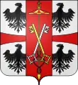 (fr)D’argent, à la croix pattée de gueules cantonnée de quatre aigles de sable au vol abaissé; sur le tout écartelé, au premier et au quatrième de gueules au lion à la queue fourchée d'argent armé et lampassé d’or, couronné et colleté du même, au deuxième et au troisième fascé d'or et de sable