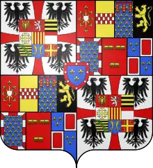 (fr)D’argent, à la croix pattée de gueules cantonnée de quatre aigles de sable éployées et affrontées; sur le tout parti de deux et coupé de deux, au premier de gueules à l'aigle bicéphale éployée d'or à la double couronne du même, qui est de l'Empire Romain d'Orient, au deuxième de gueules au lion à la queue fourchée d'argent, armé et lampassé d'or, couronné et colleté du même qui est de Bohême, au troisième fascé d'or et de sable qui est de Gonzague ancien, au quatrième d’argent à la croix potencée d'or cantonnée de quatre croisettes du même qui est de Jérusalem, au cinquième d'or aux quatre pals de gueules qui est d'Aragon, au sixième d’argent au chef de gueules qui est de Montferrat, au septième fascé d’or et de sable de dix pièces au crancelin de sinople brochant en bande qui est de Saxe, au huitième d’azur semé de croisettes recroisettées et de clous d’or à deux bars adossés du même qui est de Bar, au neuvième de gueules à la croix d'or cantonnée de quatre briquets du même adossés deux par deux qui est de Constantinople; au point d'honneur, de gueules à la fasce d'argent qui est d'Autriche, timbré d'une couronne archiducale