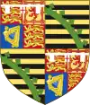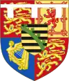 Écartelé : I et IV de gueules à trois léopards d'or armés et lampassés d'azur (d'Angleterre) ; II d'or, au lion de gueules, au double trescheur fleuronné et contre-fleuronné du même (d'Écosse) ; III d'azur, à la harpe d'or, cordée d'argent (d'Irlande) ; au lambel à cinq pendants d'argent brochant, ceux à dextre et sénèstre chargés d'une croix de gueules (dite de Saint Georges), les autres chargés d'une fleur-de-lys d'azur ; sur-le-tout burelé de dix pièces de sable et d'or au crancelin de sinople, brochant en bande sur le tout (de Saxe)[13]. |