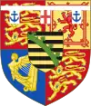 Écartelé : I et IV de gueules à trois léopards d'or armés et lampassés d'azur (d'Angleterre) ; II d'or, au lion de gueules, au double trescheur fleuronné et contre-fleuronné du même (d'Écosse) ; III d'azur, à la harpe d'or, cordée d'argent (d'Irlande) ; au lambel à cinq pendants d'argent brochant, celui en cœur chargé d'une croix de gueules (dite de Saint Georges), ceux à dextre et sénestre chargés d'une fleur-de-lys d'azur, les autres chargés d'un trèfles de sinople ; sur-le-tout burelé de dix pièces de sable et d'or au crancelin de sinople, brochant en bande sur le tout (de Saxe)[13]. Écartelé : I et IV de gueules à trois léopards d'or armés et lampassés d'azur (d'Angleterre) ; II d'or, au lion de gueules, au double trescheur fleuronné et contre-fleuronné du même (d'Écosse) ; III d'azur, à la harpe d'or, cordée d'argent (d'Irlande) ; au lambel à cinq pendants d'argent brochant, ceux en cœur, à dextre et sénestre chargés d'une croix de gueules (dite de Saint Georges), les autres chargés d'une fleur-de-lys d'azur ; sur-le-tout burelé de dix pièces de sable et d'or au crancelin de sinople, brochant en bande sur le tout (de Saxe)[13].