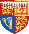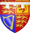 Écartelé : I et IV de gueules à trois léopards d'or armés et lampassés d'azur (d'Angleterre) ; II d'or, au lion de gueules, au double trescheur fleuronné et contre-fleuronné du même (d'Écosse) ; III d'azur, à la harpe d'or, cordée d'argent (d'Irlande) ; au lambel à cinq pendants d'argent brochant, ceux en cœur, à dextre et sénestre chargés d'une croix de gueules (dite « de Saint Georges »), les autres chargés d'un léopard de gueules[13],[14]. Écartelé : I et IV de gueules à trois léopards d'or armés et lampassés d'azur (d'Angleterre) ; II d'or, au lion de gueules, au double trescheur fleuronné et contre-fleuronné du même (d'Écosse) ; III d'azur, à la harpe d'or, cordée d'argent (d'Irlande) ; au lambel à trois pendants d'argent brochant, chacun chargé d'une ancre d'azur[13].