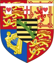 Écartelé : I et IV de gueules à trois léopards d'or armés et lampassés d'azur (d'Angleterre) ; II d'or, au lion de gueules, au double trescheur fleuronné et contre-fleuronné du même (d'Écosse) ; III d'azur, à la harpe d'or, cordée d'argent (d'Irlande) ; au lambel à cinq pendants d'argent brochant, ceux en cœur, à dextre et sénestre chargés d'une croix de gueules (dite de Saint Georges), les autres chargés d'un chardon au naturel ; sur-le-tout burelé de dix pièces de sable et d'or au crancelin de sinople, brochant en bande sur le tout (de Saxe)[13]. Écartelé : I et IV de gueules à trois léopards d'or armés et lampassés d'azur (d'Angleterre) ; II d'or, au lion de gueules, au double trescheur fleuronné et contre-fleuronné du même (d'Écosse) ; III d'azur, à la harpe d'or, cordée d'argent (d'Irlande) ; au lambel à cinq pendants d'argent brochant, ceux en cœur, à dextre et sénestre chargés d'une rose de gueules, les autres chargés d'une croix de gueules (dite de Saint Georges) ; sur-le-tout burelé de dix pièces de sable et d'or au crancelin de sinople, brochant en bande sur le tout (de Saxe)[13].