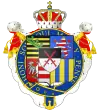 Écartelé : I et IV de gueules à trois léopards d'or armés et lampassés d'azur (d'Angleterre) ; II d'or, au lion de gueules, au double trescheur fleuronné et contre-fleuronné du même (d'Écosse) ; III d'azur, à la harpe d'or, cordée d'argent (d'Irlande) ; au lambel à trois pendants d'argent brochant, celui en cœur chargé d'un cœur de gueules (dite de Saint Georges), les deux autres chargés d'une rose de gueules ; sur-le-tout burelé de dix pièces de sable et d'or au crancelin de sinople, brochant en bande sur le tout (de Saxe)[13]. |