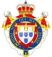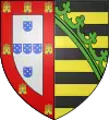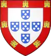 D'argent à cinq écussons d'azur disposés en croix, chaque écusson chargé de cinq besants d'argent, à la bordure de gueules chargé de sept châteaux d'or, lambel de trois pieds posé sour le tout, les trois pieds vierges.