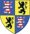Parti de deux et coupé de cinq : I, d'azur au lion burelé d'argent et de gueules, couronné d'or (de Thuringe) ; II, de gueules, à l'écusson d'argent, aux rais d'escarboucle d'or, brochantes sur le tout (de Clèves) ; III, d'or, au lion de sable, armé et lampassé de gueules (de Misnie) ; IV, d'or, au lion de sable, armé et lampassé de gueules (de Juliers) ; V, en forme de sur-le-tout, burelé de sable et d'or, au crancelin de sinople, brochant en bande sur le tout (de Saxe) ; VI, d'argent, au lion de gueules, armé et lampassé d'azur et couronné d'or (de Berg) ; VII, d'azur, à l'aigle d'or (du Palatinat de Saxe) ; VIII, d'or, à deux pals d'azur (de Landsberg) ; IX, de sable, à l'aigle d'or (du Palatinat de Thuringe) ; X, d'or, semé de cœurs de gueules, au lion de sable, armé, lampassé et couronné du deuxième, brochant sur-le-tout (d'Orlamünde) ; XI, d'argent, à trois fasces d'azur (d'Eisenberg) ; XII, d'azur, au lion coupé d'or et d'argent (de Pleissen (de)) ; XIII, d'argent, à la rose de gueules, boutonnée d'or et pointée de sinople (d'Altenbourg) ; XIV, de gueules (du Droit de régale) ; XV, d'argent à trois bouterolles de gueules (d'Angrie) ; XVI, d'or à la fasce échiquettée d'argent et de gueules de trois tires (de La Marck) ; XVII, parti de gueules à un colonne d'argent surmonté d'une couronne d'or (de Römhild) et d'or, à une poule de sable, crêtée, becquée et membrée de gueules, posée sur un mont de sinople, issant de la pointe de l'écu (de Henneberg (de)) ; XVIII, d'argent, à trois chevrons de gueules (de Ravensberg)[8]. Voir les armoiries de sa descendance dans l'article détaillé. |