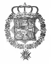 Ferdinand II (1816 † 1885), le roi consort (1837-1853) de Marie II, portait : parti en 1 d'argent à cinq écussons d'azur disposés en croix, chaque écusson chargé de cinq besants d'argent, à la bordure de gueules chargé de sept châteaux d'or et en 2 burelé de sable et d'or, au crancelin de sinople, brochant en bande sur le tout. |