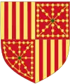 Jean Raimond III Folch (1418 † 1486), comte de Cardona et Prades, baron d'Entença, fils de Jeanne (? † 1441), comtesse de Prades, arrière-petit-fils de l'infant Pierre d'Aragon et Anjou (1305 † 1380), Pierre IV, comte de Ribagorce. Parti : I, de gueules à trois chadrons d'or; II, écartelé en sautoir : I et IV, d'or à deux pals de gueules; II et III, semé de fleurs de lys d'or; un lambel de gueules, brochant sur la partition[19]. |