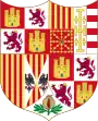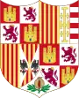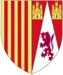 Ferdinand II, roi d'Aragon (1452 † 1516), Ferdinand V, roi de Castille (1474 - 1504) avec Isabelle Ier. 1474 - 1492 : Écartelé en I et IV contre-écartelé en 1 et 4, de gueules au château d'or ouvert et ajouré d'azur et en 2 et 3 d'argent au lion de gueules armé, lampassé et couronné d'or; en II et en III parti, en 1 d'or à quatre pals de gueules et en 2 écartelé en sautoir d'or aux quatre pals de gueules et d'argent à l'aigle de sable 1492 - 1504 : Écartelé en I et IV contre-écartelé en 1 et 4, de gueules au château d'or ouvert et ajouré d'azur et en 2 et 3 d'argent au lion de gueules armé, lampassé et couronné d'or; en II et en III parti, en 1 d'or à quatre pals de gueules et en 2 écartelé en sautoir d'or aux quatre pals de gueules et d'argent à l'aigle de sable, le tout accompagné en pointe d'argent à une pomme grenade de gueules, tigée et feuilleté de sinople[2]. 1504 - 1513 : Écartelé en I et IV contre-écartelé en 1 et 4, de gueules au château d'or ouvert et ajouré d'azur et en 2 et 3 d'argent au lion de gueules armé, lampassé et couronné d'or; en II, parti en 1 d'or à quatre pals de gueules; en 2 parti, en a d'argent à la croix potencé d'or et en b fasce de gueules et d'argent et en III parti, en 1 d'or à quatre pals de gueules et en 2 écartelé en sautoir d'or aux quatre pals de gueules et d'argent à l'aigle de sable, le tout accompagné en pointe d'argent à une pomme grenade de gueules, tigée et feuilleté de sinople[2]. 1513 - 1516 : Écartelé en I et IV contre-écartelé en 1 et 4, de gueules au château d'or ouvert et ajouré d'azur et en 2 et 3 d'argent au lion de gueules armé, lampassé et couronné d'or; en II, parti en 1 coupé d'or à quatre pals de gueules et de gueules aux chaînes d'or posées en orle, en croix et en sautoir, chargées en cœur d'une émeraude au naturel; en 2 parti, en a d'argent à la croix potencé d'or et en b fasce de gueules et d'argent et en III parti, en 1 d'or à quatre pals de gueules et en 2 écartelé en sautoir d'or aux quatre pals de gueules et d'argent à l'aigle de sable, le tout accompagné en pointe d'argent à une pomme grenade de gueules, tigée et feuilleté de sinople[2]. |