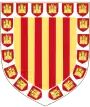 Raimond-Bérenger IV, comte de Barcelone et Alphonse II, roi d'Aragon, (1150 - 1177) : D'or à quatre pals de gueules à l'escarboucle pommetée à six rais d'or brochant sur le tout[1]. (Armes du comté de Barcelone devenues celles des rois d'Aragon après qu'Alphonse Ier, comte de Barcelone, devint roi d'Aragon). L'histoire de cet écu est la suivante: le roi se meurt lors d'une bataille à "déterminer". L'un de ses compagnons pose sa main sur son corps ensanglanté puis dépose quatre doigts de sa main sur son bouclier et trace quatre bandes rouge sang sur ce bouclier doré. |