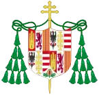 Fernand d'Aragon et Gurrea (1498 † 1575), archevêque de Saragosse et vice-roi d'Aragon, illégitime fils de Alphonse d'Aragon (1470 † 1520), archevêque de Saragosse. Écartelé en I et IV contre-écartelé en 1 et 4, de gueules au château d'or ouvert et ajouré d'azur et en 2 et 3 d'argent au lion de gueules armé, lampassé et couronné d'or; en II, parti en 1 coupé d'or à quatre pals de gueules et de gueules aux chaînes d'or posées en orle, en croix et en sautoir, chargées en cœur d'une émeraude au naturel; en 2 parti, en a d'argent à la croix potencé d'or et en b fasce de gueules et d'argent et en III parti, en 1 d'or à quatre pals de gueules et en 2 écartelé en sautoir d'or aux quatre pals de gueules et d'argent à l'aigle de sable, le tout accompagné en pointe d'argent à une pomme grenade de gueules, tigée et feuilleté de sinople[35]. |