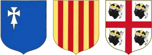 Royaume de Sicile (Depuis 1409), maison d'Aragon. Parti en 1 d'or à quatre pals de gueules et en 2 écartelé en sautoir d'or aux quatre pals de gueules et d'argent à l'aigle de sable[30]. |