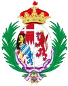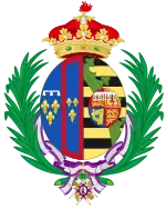 1866[Information douteuse]-1930 : parti en I, écartelé en 1 d'azur aux trois fleurs de lis d'or au lambel d'argent (d'Orléans), en 2 d'azur aux trois fleurs de lys d'or à la bourdure de gueules (d'Anjou) et en 3 et 4 parti en 1 d'azur aux trois fleurs de lys d'or à la bourdure de gueules et 2 écartelé en sautoir d'or aux quatre pals de gueules et d'argent à l'aigle de sable (de Bourbon-Deux Siciles) ; en II écartelé en 1 et 4, de gueules au château d'or ouvert et ajouré d'azur et en 2 et 3 d'argent au lion de gueules armé, lampassé et couronné d'or, enté en pointe du sur-le-tout d'argent à une pomme grenade de gueules, tigée et feuilleté de sinople sur-le-tout d'azur à trois fleurs de lys d'or à la bordure de gueules, après 1883, d'azur à trois fleurs de lys d'or[Information douteuse]. 1930-1958 : écartelé en 1 et 4, de gueules au château d'or ouvert et ajouré d'azur et en 2 et 3 d'argent au lion de gueules armé, lampassé et couronné d'or, enté en pointe du sur-le-tout d'argent à une pomme grenade de gueules, tigée et feuilleté de sinople sur-le-tout d'azur à trois fleurs de lys d'or[Information douteuse]. |