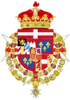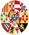 coupé de deux : en I, parti de trois : en 1, d'or à quatre pals de gueules, en 2, écartelé en sautoir d'or aux quatre pals de gueules et d'argent à l'aigle de sable, en 3, de gueules à la fasce d'argent et en 4, d'azur semé de fleurs de lys d'or à la bordure componée d'argent et de gueules ; en II, parti d'or à six fleurs de lys d'azur posées 3, 2 et 1 et d'or à six tourteaux mis en orle, cinq de gueules, celui en chef d'azur chargé de trois fleurs de lis d'or ; en III, parti bandé d'or et d'azur de six pièces, à la bordure de gueules et de sable, au lion d'or, armé et lampassé de gueules ; enté en pointe parti d'or, au lion de sable, armé et lampassé de gueules et d'argent à l'aigle éployé de gueules, membré et becqué d'or ; sur-le-tout, écartelé en 1 et 4, de gueules au château d'or ouvert et ajouré d'azur et en 2 et 3 d'argent au lion de gueules armé, lampassé et couronné d'or, enté en pointe du sur-le-tout d'argent à une pomme grenade de gueules, tigée et feuilleté de sinople ; sur-le-tout-du-tout d'azur à trois fleurs de lys d'or à la bordure de gueules[35], portées ensuite par :