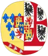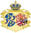 parti de deux, en I coupé d'or aux six fleurs de lys d'azur posées 3, 2 et 1, (qui est de Farnèse) et d'argent, à cinq écussons d'azur, posés en croix, les deux de flanc mis de côté, chaque écusson chargé de cinq besants du champ, posés en sautoir, à la bordure de gueules, chargée de neuf châteaux d'or, donjonnés de trois tours, ouverts et ajourés d'azur (qui est du Portugal), en II coupé écartelé en 1 et 4, de gueules au château d'or ouvert et ajouré d'azur (qui est de Castille) et en 2 et 3 d'argent au lion de gueules armé, lampassé et couronné d'or (qui est deon) et d'azur semé de fleurs de lys d'or au lambel de gueules (qui est de Naples) et en III d'or à six tourteaux mis en orle, cinq de gueules, celui en chef d'azur chargé de trois fleurs de lis d'or (qui est de Toscane) ; sur le tout d'azur, à trois fleurs de lys d'or, à la bordure de gueules, (qui est d'Anjou)[45]. |