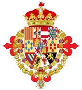 parti en I, d'argent à cinq écussons d'azur en croix, chargés chacun de cinq besants en sautoir, le tout augmenté d'une bordure de gueules à sept châteaux d'or ouverts d'azu (de Portugal) ; en II coupé : en chef parti en 1 écartelé en 1 et 4, de gueules au château d'or ouvert et ajouré d'azur et en 2 et 3 d'argent au lion de gueules armé, lampassé et couronné d'or enté en pointe d'argent à une pomme grenade de gueules, tigée et feuilleté de sinople; 2 parti en 1 d'or à quatre pals de gueules et en 2 écartelé en sautoir d'or aux quatre pals de gueules et d'argent à l'aigle de sable;II, tigée et feuilleté de sinople et en pointe écartelé en 1 de gueules à la fasce d'argent; 2, d'azur semé de fleurs de lys d'or à la bande componée d'argent et de gueules, en 3 bandé d'or et d'azur de six pièces, à la bordure de gueules 4, de sable au lion d'or, armé et lampassé de gueules; enté en pointe parti d'or au lion de sable armé, couronné et lampassé de gueules et d'argent à l'aigle éployé de gueules, membré et becqué d'or;sur le tout d'azur à trois fleurs de lys d'or à la bordure de gueules[29]. coupé de deux : en I, d'argent à cinq écussons d'azur en croix, chargés chacun de cinq besants en sautoir, le tout augmenté d'une bordure de gueules à sept châteaux d'or ouverts d'azu (de Portugal) ; en II, coupé : en chef parti en 1 écartelé en 1 et 4, de gueules au château d'or ouvert et ajouré d'azur et en 2 et 3 d'argent au lion de gueules armé, lampassé et couronné d'or enté en pointe d'argent à une pomme grenade de gueules, tigée et feuilleté de sinople; 2 parti en 1 d'or à quatre pals de gueules et en 2 écartelé en sautoir d'or aux quatre pals de gueules et d'argent à l'aigle de sable;II, tigée et feuilleté de sinople et en pointe écartelé en 1 de gueules à la fasce d'argent; 2, d'azur semé de fleurs de lys d'or à la bande componée d'argent et de gueules, en 3 bandé d'or et d'azur de six pièces, à la bordure de gueules 4, de sable au lion d'or, armé et lampassé de gueules; enté en pointe parti d'or au lion de sable armé, couronné et lampassé de gueules et d'argent à l'aigle éployé de gueules, membré et becqué d'or;sur le tout d'azur à trois fleurs de lys d'or à la bordure de gueules[30]. |