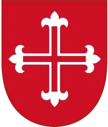 D'argent, au sautoir de gueules chargé avec cinq écussons d'azur, chaque écusson chargé de cinq besants d'argent et de quatre croix fleurdelisées d'argent, chaque une chargé d'une croisette de gueules'' |