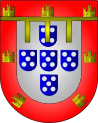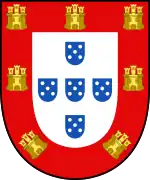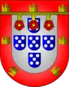 Rois de Portugal de la Dynastie de Bragance D'argent à cinq écussons d'azur disposés en croix, chaque écusson chargé de cinq besants d'argent, à la bordure de gueules chargé de sept châteaux d'or |