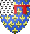 Mi-parti d'azur à trois fleurs de lys d'or à la bande de gueules et d'azur à trois fleurs de lys d'or