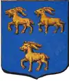 D'azur semé de besants d'or, au lion d'argent, la queue contournée, armé de gueules et lampassé d'or. |
