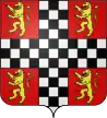 De gueules, à une couronne de deux branches de laurier d’argent ; au chef échiqueté d’argent et d’azur de 3 tires |