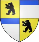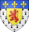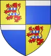 Parti : au 1 d'argent, au chevron de gueules, chargé de trois fleurs de lys d'or ; au 2 d'azur au lion d'or, couronné de même, lampassé et armé de gueules.[29] |