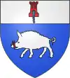 D'azur à un sanglier passant d'argent, défendu de gueules ; au chef d'argent chargé d'une tour de gueules crénelée et ajourée, la porte ouverte d'azur au ruisseau naissant de cette porte du même.[28]