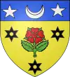 D'or, à la rose de gueules, pointée, tigée, et feuillée de sinople, accostée en chef de deux molettes de sable et soutenue d'une pareille ; au chef d'azur chargé d'un croissant d'argent entre deux étoiles de même.[24] |