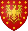 De gueules à l'aigle d'or accompagnée d'un orle de besants d'or.[29] Alias un orle de fers de lance d'argent.[29] |
