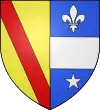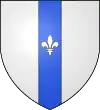 D'azur, à trois fleurs de lys d'or, 2 et 1, à la cotice de gueules brochant sur le tout.[37]