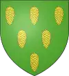 Parti : au 1 palé d'or et d'azur de six pièces ; au 2 d'or, au pin de sinople ; au chef de gueules, chargé de trois étoiles d'or.[10] |
