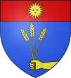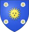 D'azur, au soleil d'or, cantonné de quatre roses d'argent, boutonnées d'or.[32] |