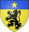 Coupé d'azur et de gueules, à la fasce d'argent accompagnée en pointe d'un coq d'argent chantant sur un mont de même ; au franc-canton de trois étoiles 1 et 2, accosté à senestre d'un croissant, le tout d'argent.[1] Alias de gueules à la bande d'argent accompagnée d'un coq sur un roc de même, au chef cousu d'azur chargé de trois étoiles surmontées d'un croissant. |