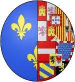 parti de mi-parti de France, qui est d'azur aux trois fleurs de lys d'or et de l'écartelé au 1 et 4 de Médicis, qui est d'or à six boules en orles, la supérieure de France, les autres de gueules et au 2 et 3 d'Autriche, qui est de gueules à la fasce d'argent. |