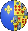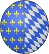 parti, de France moderne, qui est d'azur aux trois fleurs de lys d'or et écartelé au 1 et 4 d'azur aux trois fleurs de lys d'or et au 2 et 3 d'hermine. | |
