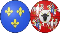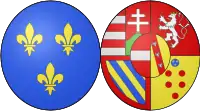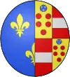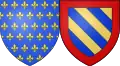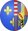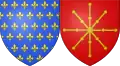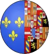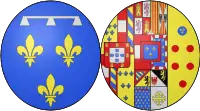 parti de mi-parti de France moderne, qui est d'azur aux trois fleurs de lys d'or et contre-parti d'argent à la croix potencée d'or, cantonnée de quatre croisettes du même et mi-parti d'azur semé de lys d'or et au lambel de gueules et d'azur semé de lys d'or et à la bourdure de gueules. | |