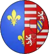 parti de mi-parti de France, qui est d'azur aux trois fleurs de lys d'or et écartelé en 1 et 4 de gueules, au lion d'argent à la queue fourchée passée en sautoir, couronné, armé et lampassé d'or et en 2 et 3 fasce de gueules et d'argent, sur le tout parti de gueules à la fase d'argent et bandé d'or et d'azur à la bordure de gueules. | |