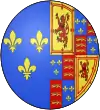 parti de France, qui est d'azur aux trois fleurs de lys d'or et écartelé au 1 et 4 d'Écosse, qui est d'or, au lion de gueules, au double trescheur fleuronné et contre-fleuronné du même et au 2 et 4 au 1 et 4 de France moderne d'azur aux trois fleurs de lys d'or et au 2 et 3 d'Angleterre, qui est de gueules aux trois léopards d'or, armés, lampassés d'azur. | |
