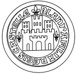 ![]() Blanche de Castille (1188 † 1190), mariée en 1200 à Louis VIII le Lion (1187 † 1226) Son sceau la représente entre six fleurs de lys, son contre sceau montre le château de Castille associé à trois fleurs de lys. Son père portait : de gueules au château donjonné de trois tours d'or ouvert et ajouré d'azur. Plusieurs vitraux contemporains la représentent avec ces armoiries, et le château est un élément héraldique repris par ses fils cadets pour accompagner leur brisure :