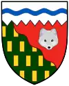 Territoires du Nord-Ouest Tranché-ondé cousu de gueules au masque de renard arctique d’argent sur sinople billeté d’or, au chef dentelé d’argent chargé d’une burèle ondée d’azur. |