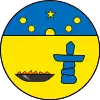 Nunavut D'or, à dextre un qulliq de sable allumé de gueules, à senestre un inuksuk d'azur, au chef du même chargé de cinq besants d'or posés en arc renversé, mouvants du bas du chef et surmontés d'une étoile du même. |