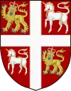 Terre-Neuve-et-Labrador De gueules à la croix d’argent cantonnée aux un et au quatre d’un léopard d’or ceint de la couronne royale du même, aux deux et trois d’une licorne passant d’argent armée, crinée et onglée d’or, colletée d’une couronne de croix pattées et de fleurs de lis munie d’une chaîne passant entre ses pattes antérieures et recourbée sur son dos, le tout du même. |