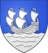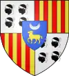 D'azur à six besants d'argent 3,2 et 1, au chef d'or[15]. |