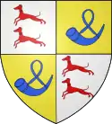 D'azur au cor de chasse d'argent, lié et enguiché de gueules, cantonné de trois molettes d'éperon d'or, deux en chef, une en pointe.[33].
