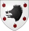 D'argent à une hure de sable aux défenses d'argent accompagnée de 5 mures de gueules ombrées d'or, posées 2,2 et 1[26]. |