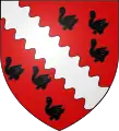 De gueules, à la bande ondée d'argent, accompagnée de six merlettes de sable[11]. |