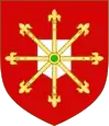 De gueules à l'escarboucle de sinople avec ses rais d'or[1] Alias De gueules, à l'écusson d'argent, aux rais d'escarboucle d'or, brochantes sur le tout[2]. |
