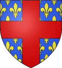 D'azur semé de fleurs de lys d'or au lambel de gueules chaque pendant chargé de trois châteaux d'or (châtelé de neuf pièces d'or)[11]. |