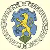 d'azur à deux chevrons d'or accompagnés en chef d'une croisette du même, en pointe d'un lion d'or issant armé et lampassé de gueules. (Il s'agissait auparavant d'un seul chevron croiseté)[12] |