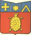 de gueules à une tortue d'or posée en pal, au chef d'azur chargé de deux vergettes d'argent, accompagnées d'une croix de Malte, d'une étoile et d'un chevron d'or.[5] |