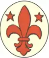 d'argent à une fleur-de-lys de gueules accompagnée en chef de deux étoiles du même.[3] |